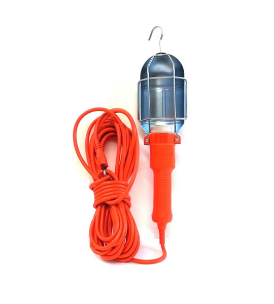 Utile lampada da officina con alimentazione 230v, dotata di griglia protettiva, gancio per appenderla, manico antiscivolo con interruttore e prolunga da 5 o 10 metri.